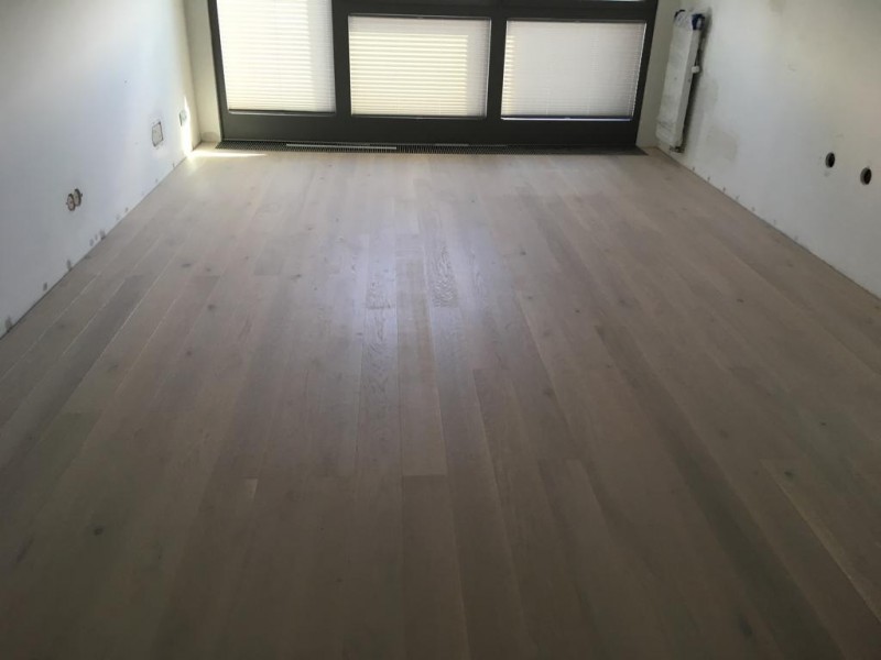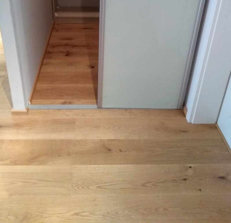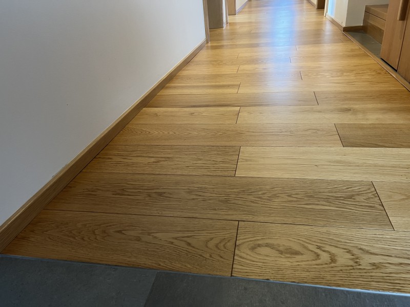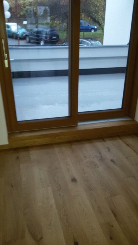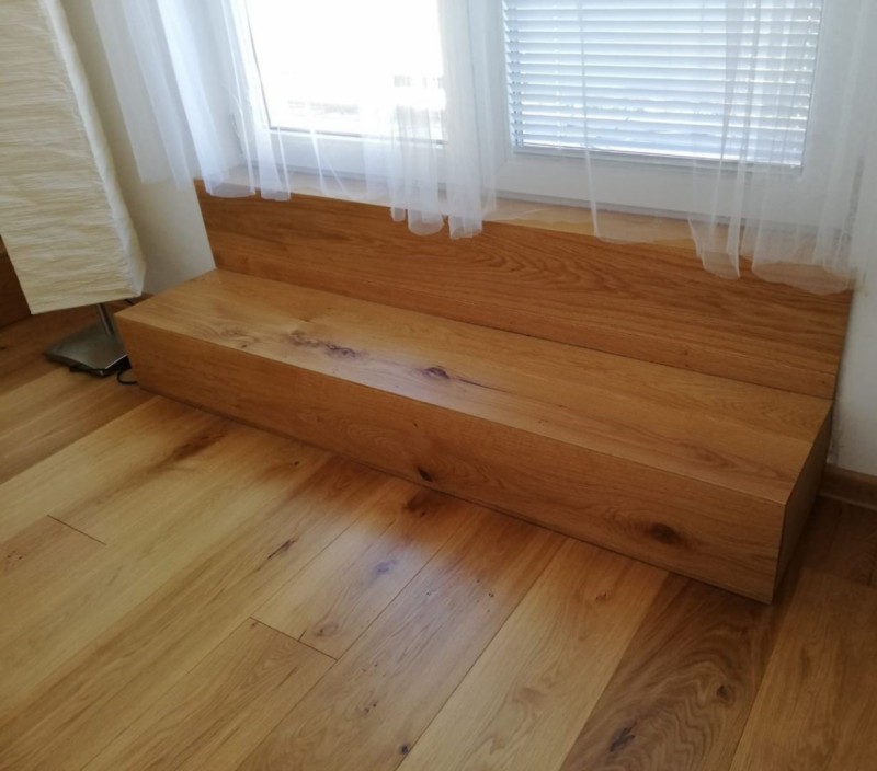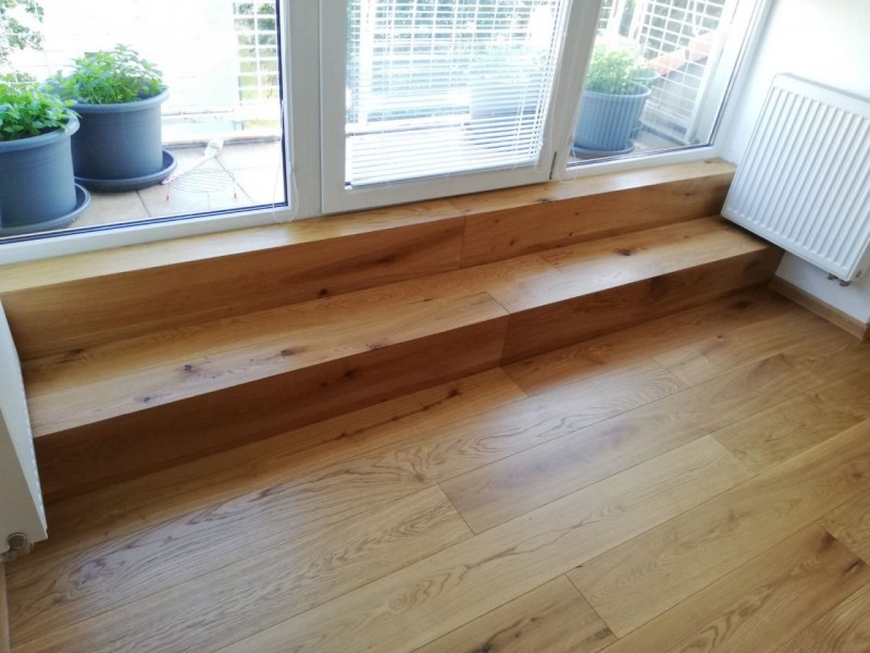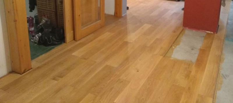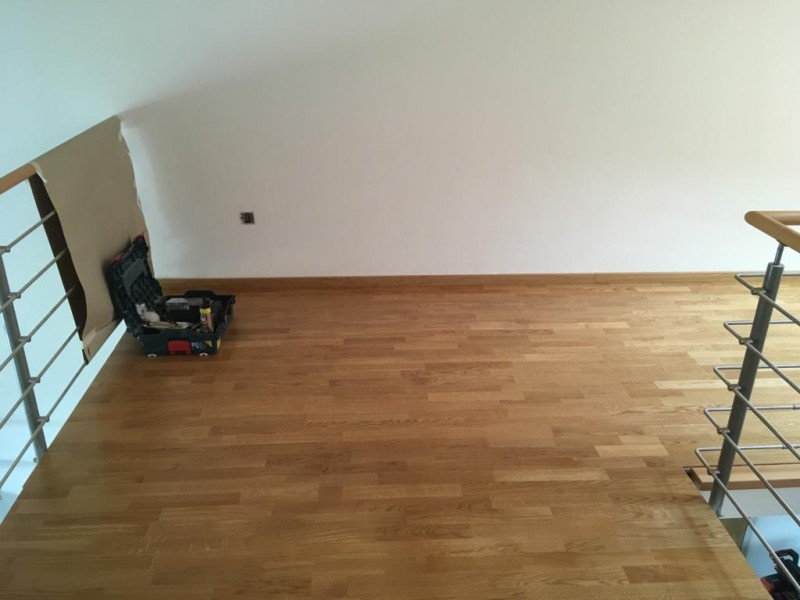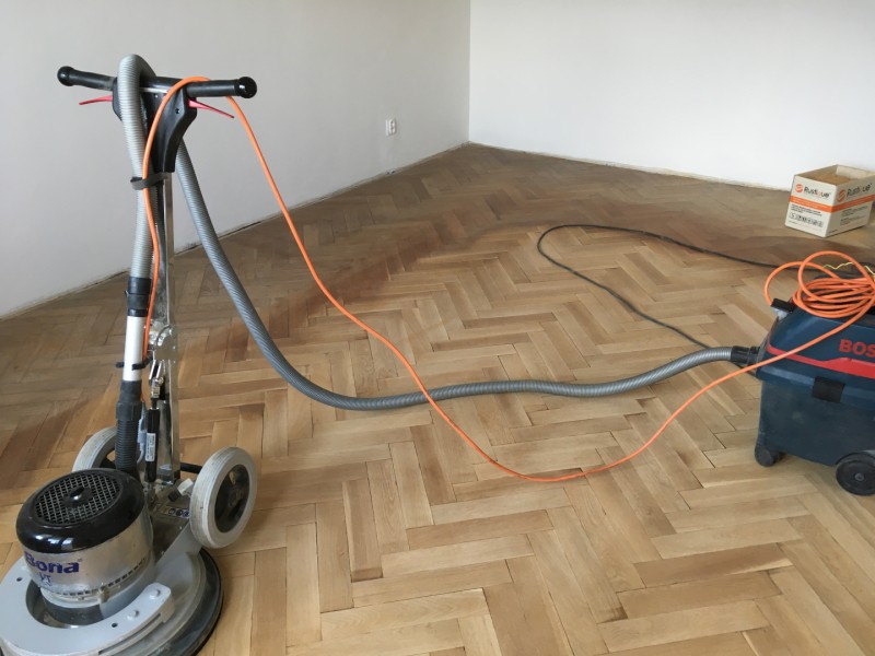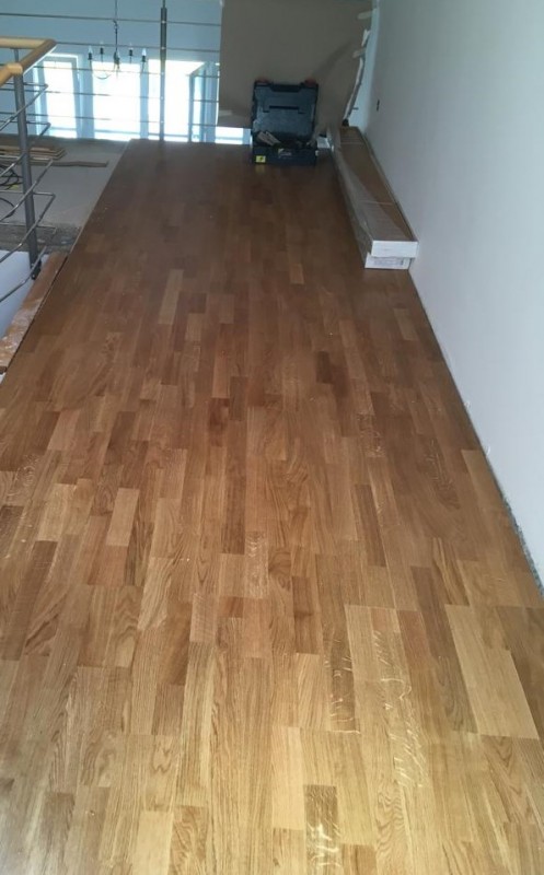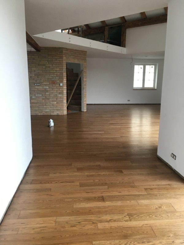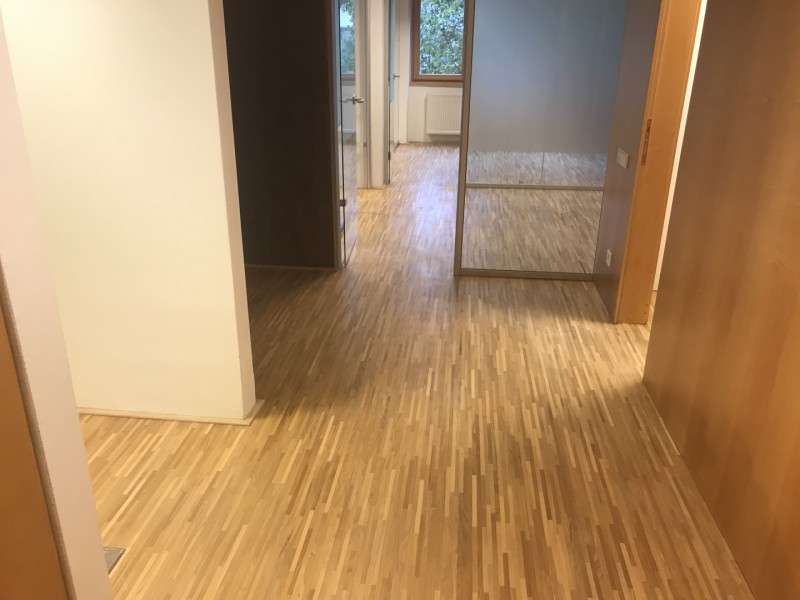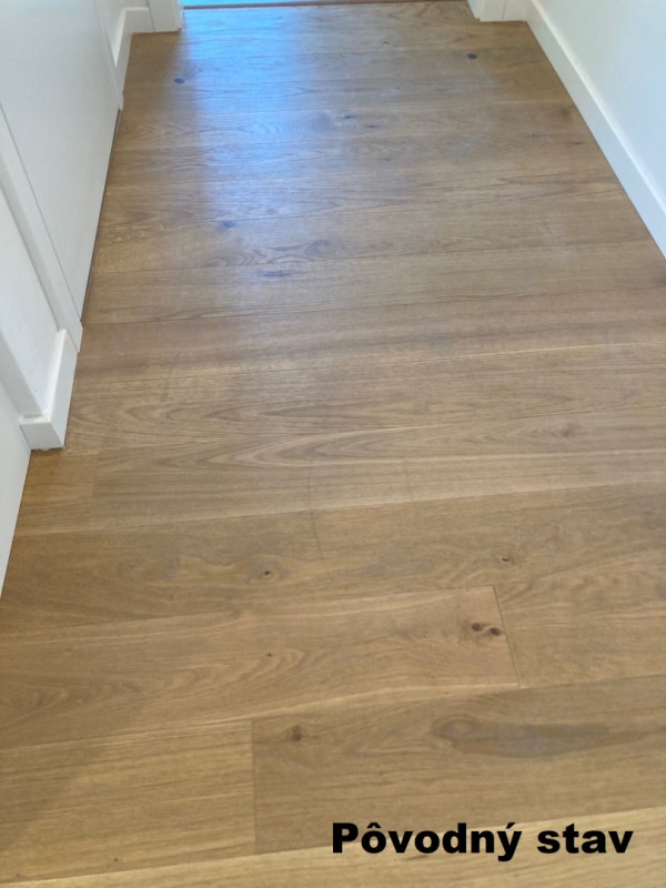 Renovácia dubové vlysy 350*50*20, dokladanie, brúsenie, lakovanie Bona Domo mat.lak