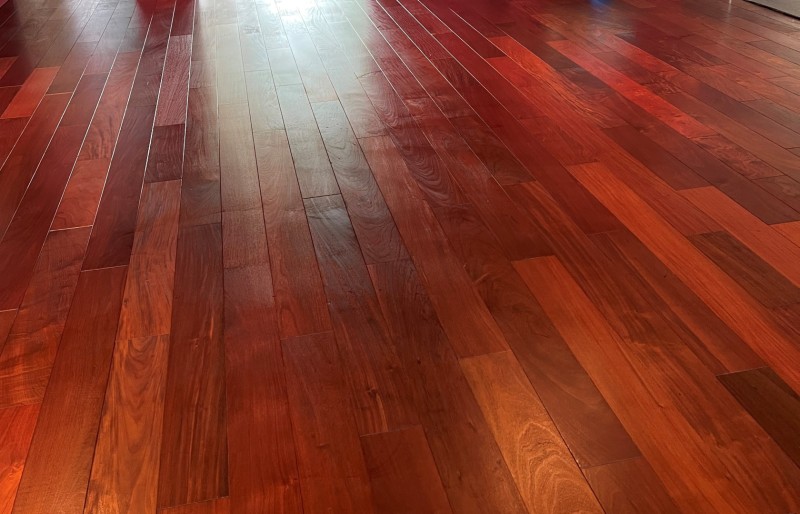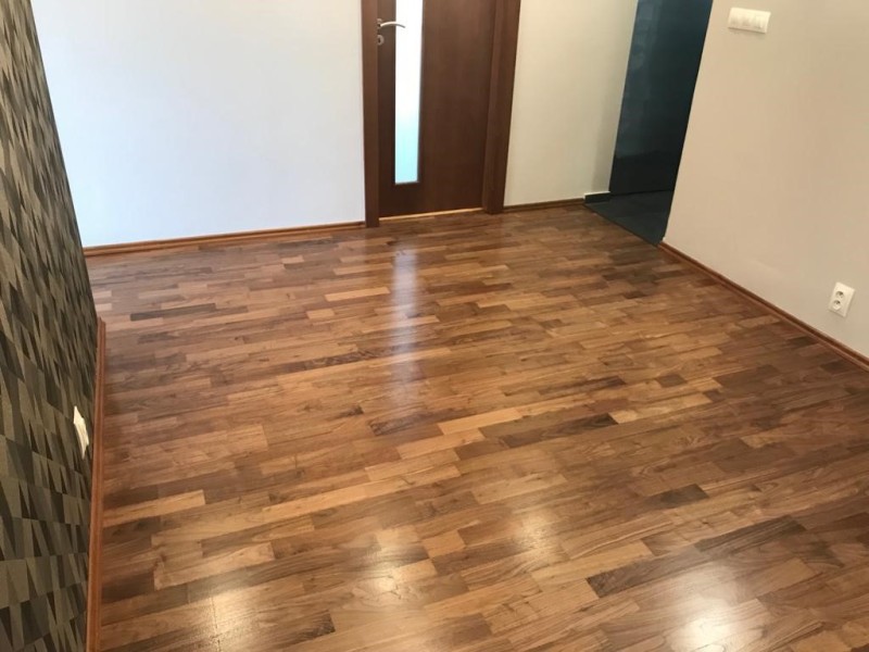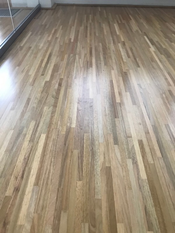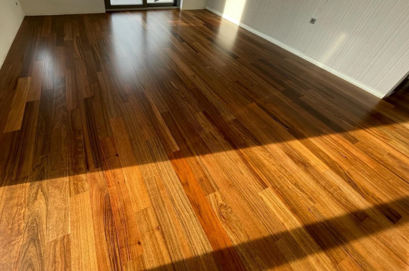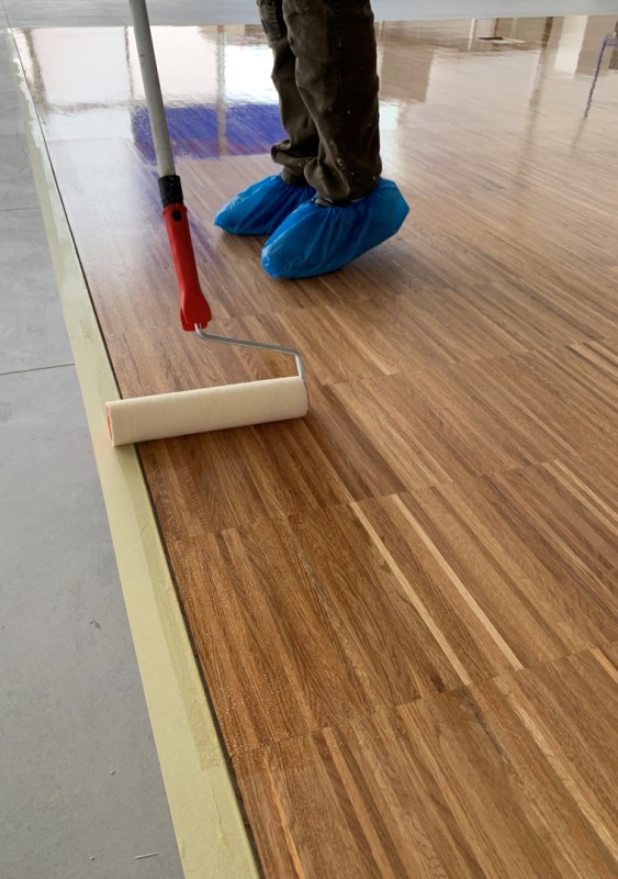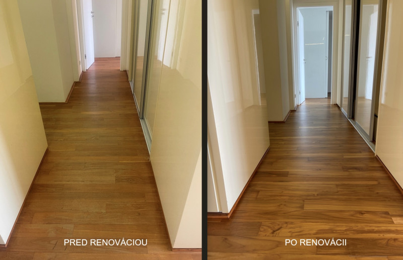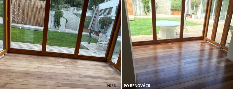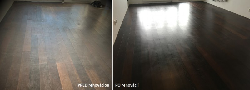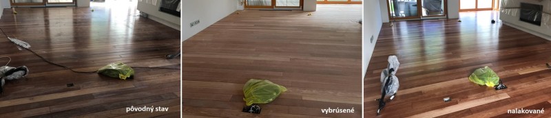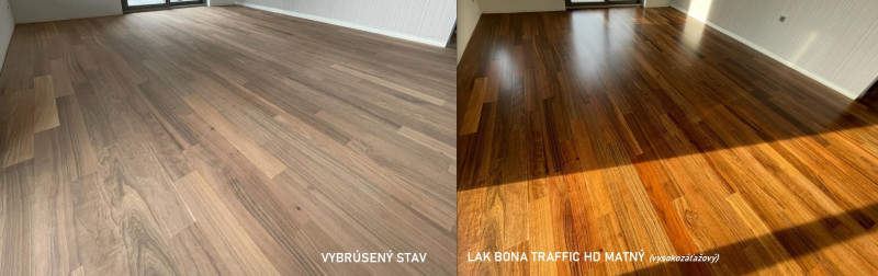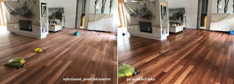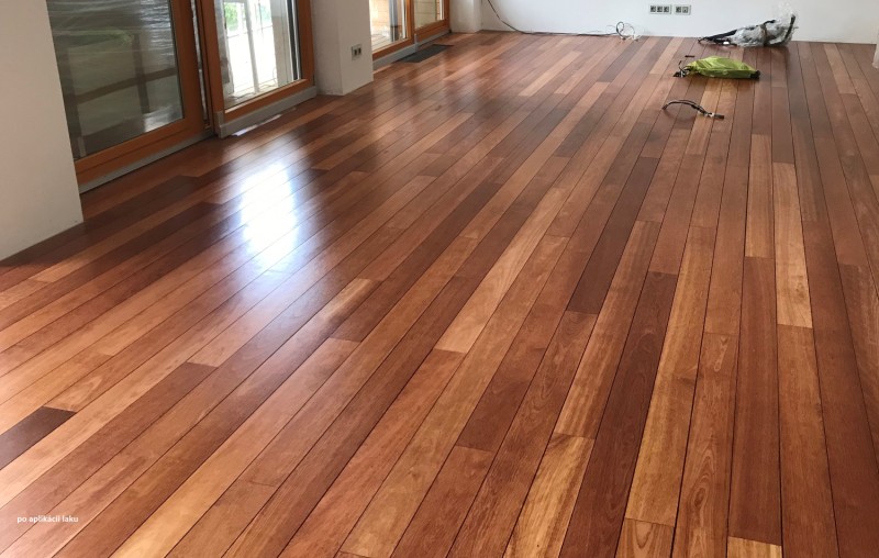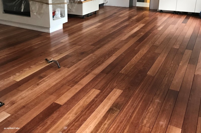 Renovácia parkiet Merbau, aplikácia vysokozáťažového laku