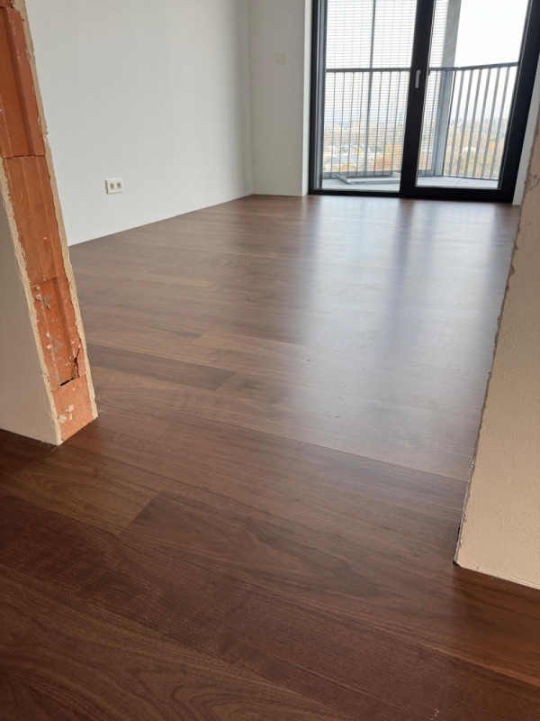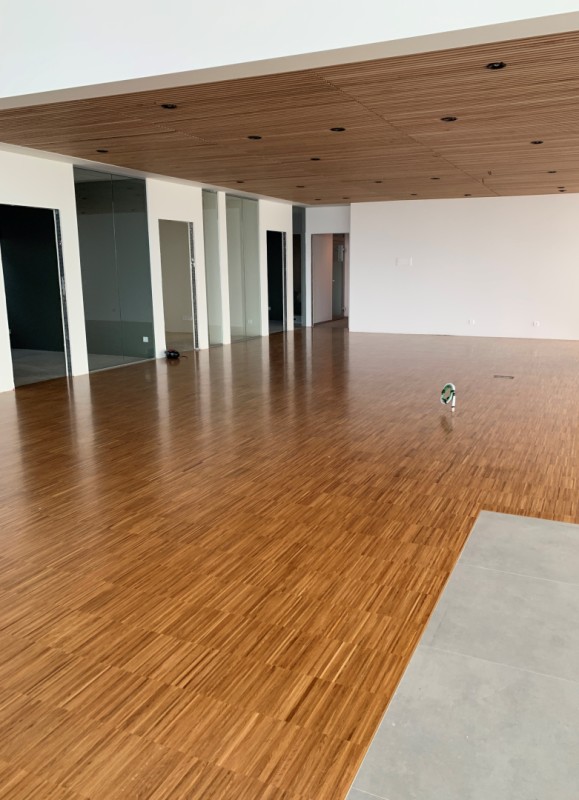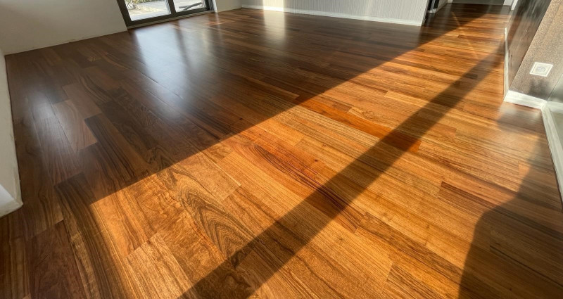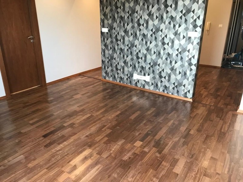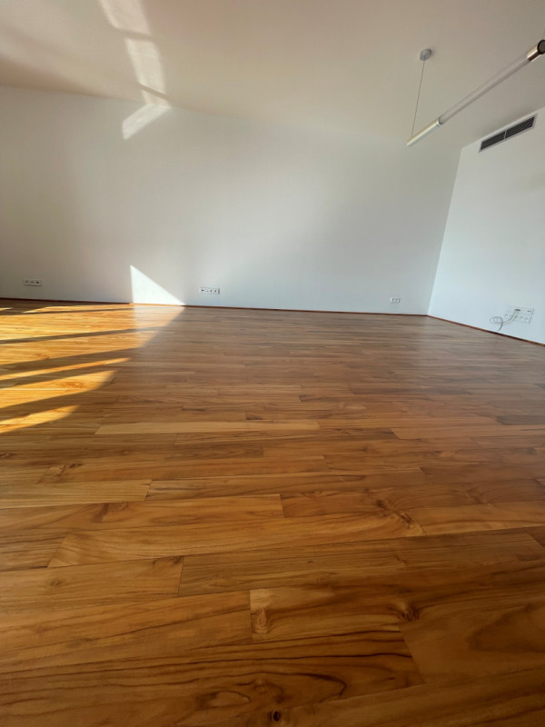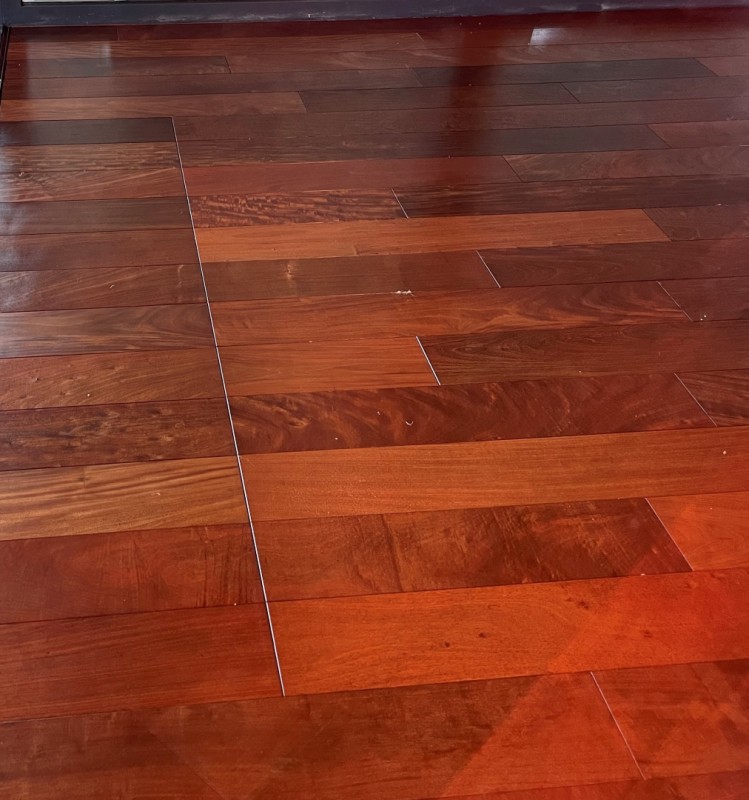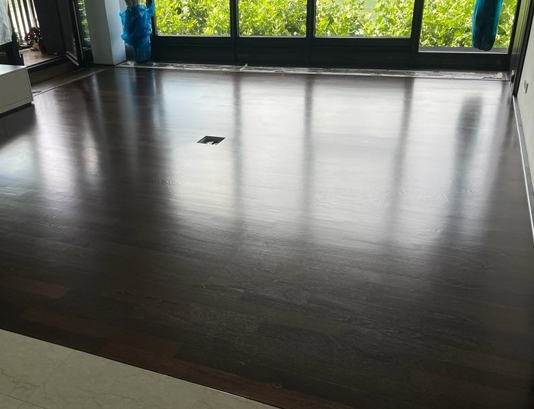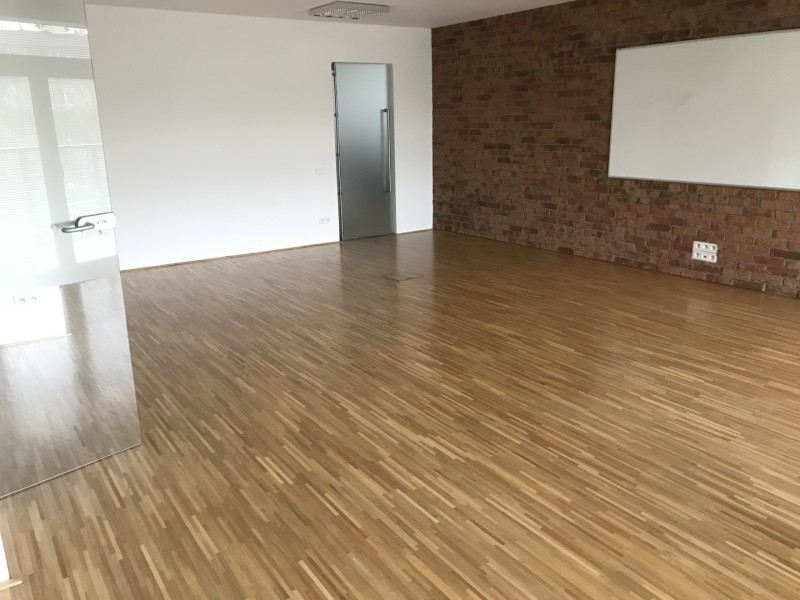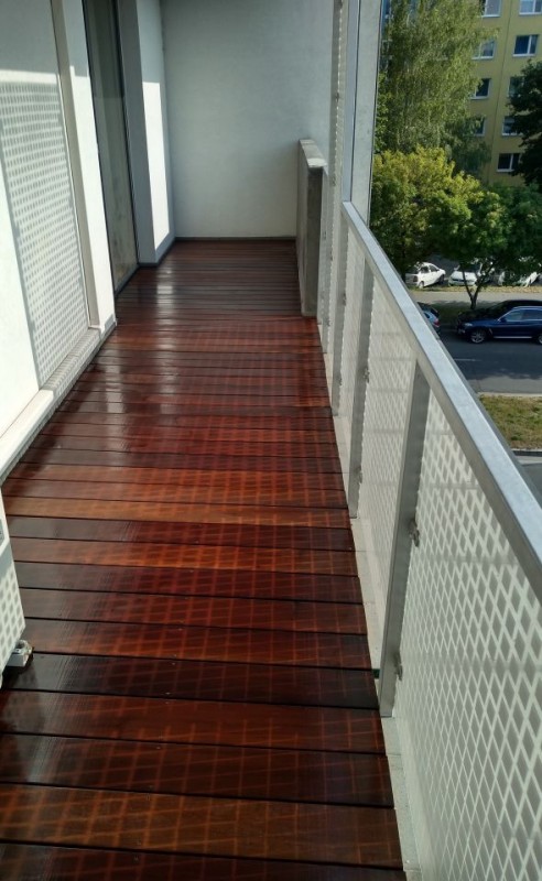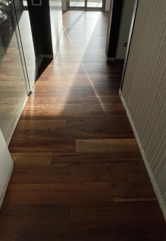 Renovácia parkiet Merbau, aplikácia vysokozáťažového laku